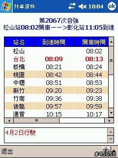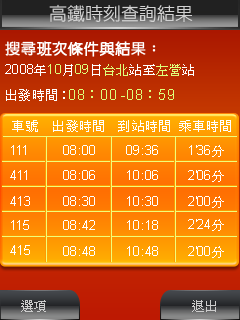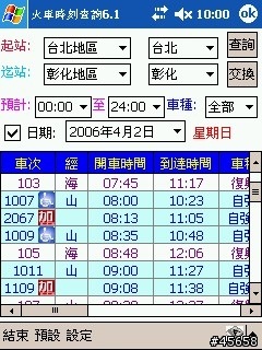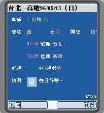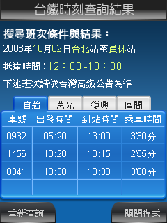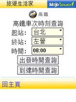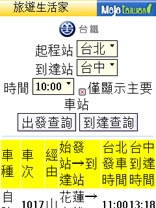 那麼在手機上是否可以查詢到台鐵火車時刻表呢?這是當然有的喔,根據整哩,現在在手機上,不論您的手機是 Windows Moible PPC PDA 手機、Nokia Symbian S60 系列手機、一般可以跑Java程式的手機、又或者是最傳統的手機,但是可以看圖片者;都可以查詢台鐵與高鐵火車時刻表喔。