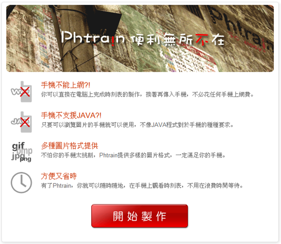 手機不能上網:因為是使用電腦將火車時刻表來製成圖片,接著將這些圖片複製到手機中,這樣,當您要查詢火車時刻表的時候,您也就不再需要透過手機上網啦,當然,您也不再需要因為要查詢火車時刻表而又花費一筆手機上網費用。