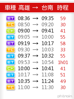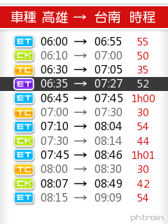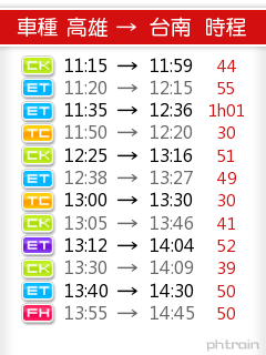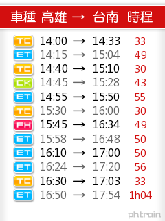 底下圖片為在電腦上透過 Phtrain 線上工具製作出來的 高雄 - 台南 之間的火車時刻表圖片。